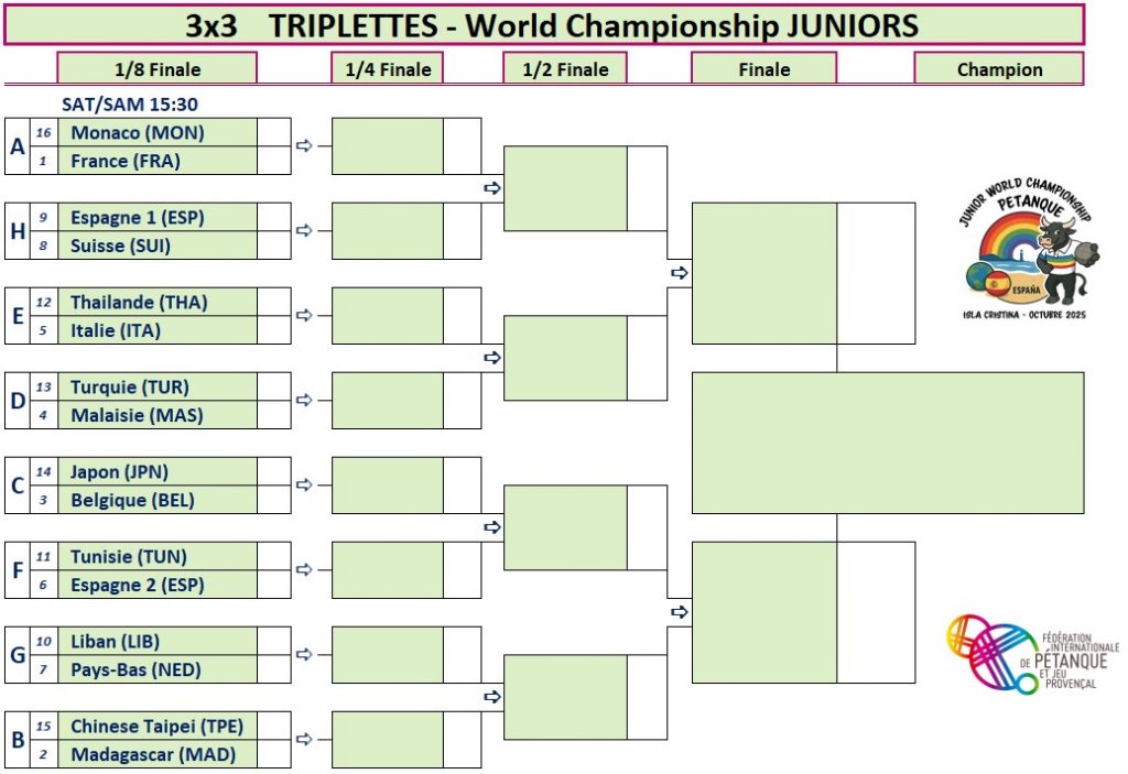 Auch im Nations Cup des Triplette Mixte geht es für unsere vier DPV-Juniors nach dem bitteren Ausscheiden am Freitag noch weiter. In der Cadrage ist es durch den 20. Rang ein Freilos, im Achtelfinale des Nations Cup kommt es um 19:30 Uhr zum Aufeinandertreffen mit dem Verlierer des Haupt-Achtelfinals zwischen Malaysia und der Türkei!