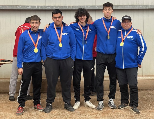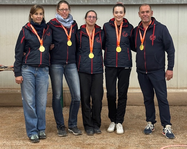 Von links nach rechts die Weltmeister*innen Juniors im „Tir de Précision“ Maria Hein und Tobias Ulrich. Maurice Racz (Coach), die Europameisterinnen Espoirs Triplette Silvana Lichte, Celine Grauer und Mercedes Strokosch und ganz rechts Leon Gotha (Coach).