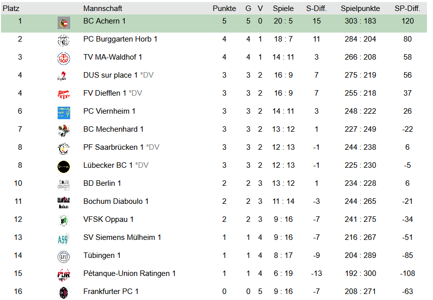 Letzte Saison kämpfte sich der BC Achern als Bundesliga-Aufsteiger nach einem Fehlstart noch mit einer positiven Bilanz (8:7) auf einen soliden achten Tabellenrang. Laut Achern-Spieler Tehina Anania ging man mit dem klaren Ziel in diese Saison, „eine positive Bilanz zu erzielen“. Dass es nun schon deutlich besser lief und Achern nach dem ersten DPB-Wochenende als einziges Team ohne Niederlage von der Tabellenspitze grüßt, hatte laut Tehina mehrere Gründe: „Das, was letztes Jahr gefehlt hatte, hat am ersten Spieltag einfach besser geklappt. Warscheinlich war es eine gute Kombi aus Teamarbeit und effektivem Coaching durch unseren Coach Jacques Pepin, der unsere Neuzugänge (Anm. d. Red.: u. a. Lasse Stentenbach und Dominique Tsuroupa) von Beginn an gut integriert hat.“ Mit einem „positivem Mindset und einem Quäntchen Glück“ gelang dem Team vom BC Achern am Samstag ein seltenes Kunststück gleich zwei Mal hintereinander: Gegen stark aufspielende NRW-Teams (Düsseldorf sur Place und Bochum Diaboulo) drehte man jeweils 0:2-Rückstände nach der Triplette-Runde durch drei gewonnene Doublettes um und entschied so die Begegnung noch für sich. Dazu drei hohe Siege gegen Siemens Mülheim (5:0), Ratingen-Lintorf (4:1) und gegen Saarbrücken (5:0) und der perfekte Saisonstart war geglückt.